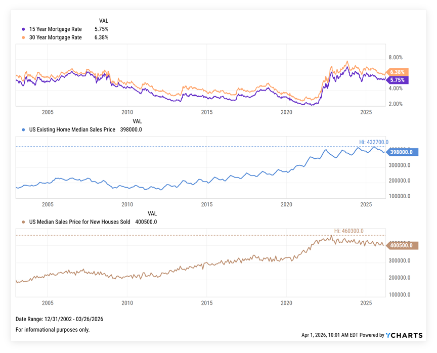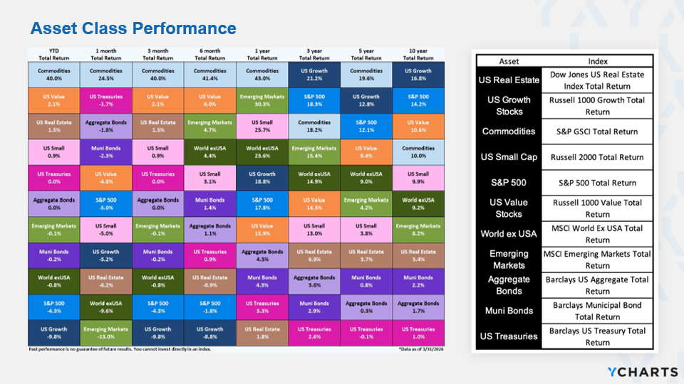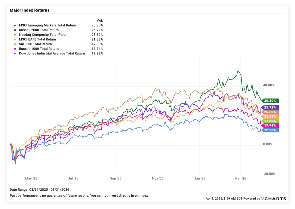 The first quarter of 2026 presented a more challenging environment, with most major markets posting modest declines. The U.S. stock market led the downturn, falling -3.96%, followed by International Developed markets at -0.94% and Emerging markets at -0.17%. Fixed income markets were also slightly negative, with the U.S. Bond market down -0.05% and Global Bonds (ex-U.S.) declining -0.19%. Global Real Estate was the lone bright spot, delivering a positive return of 0.77% for the quarter. Despite the short-term weakness, all of these markets have generated positive returns over the past 1, 5, and 10-year periods (which is encouraging). To read the full Market Review Deck, CLICK HERE.