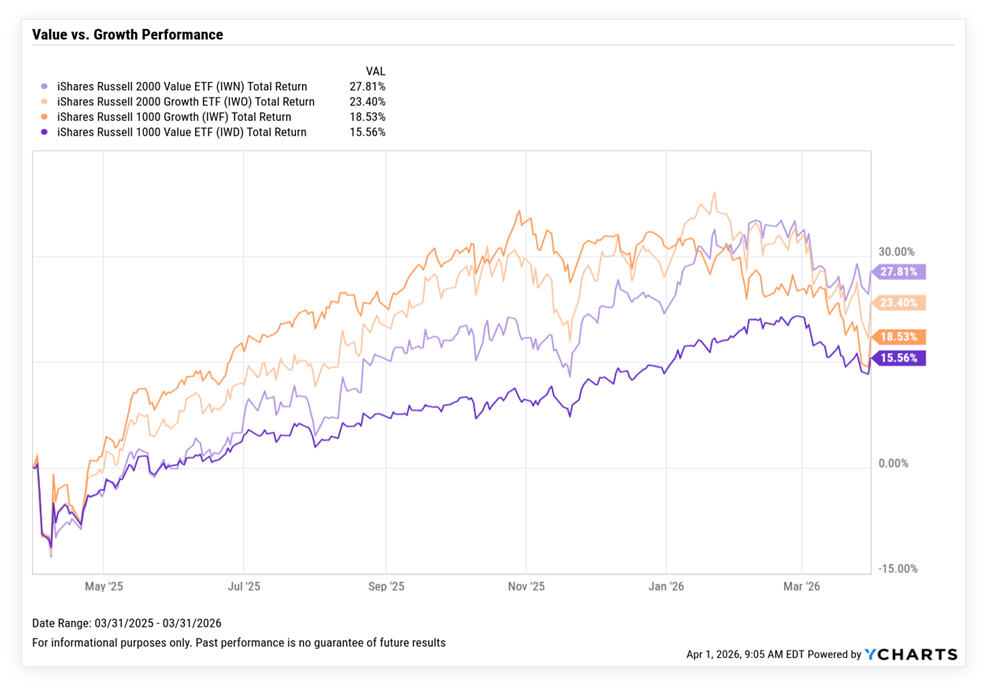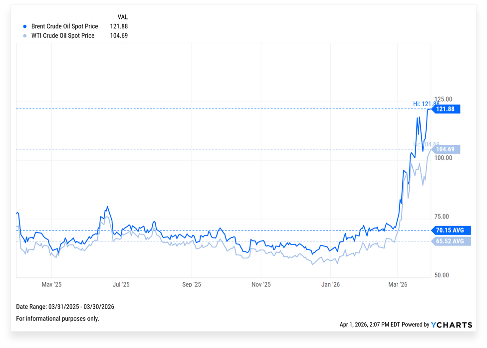 Markets have experienced significant volatility as investors wrestle with the economic and market consequences of the war with Iran. Stock prices, broadly speaking, have not fallen much relative to the size of the potential disruption. I believe the oil shock has the potential to last longer than the market currently expects — both sides appear too far apart to agree to a cease fire. A prolonged conflict could force higher oil prices, sustained inflation, and eventually higher interest rates that pressure valuations. The flip side is also true: if the President negotiates a truce, stocks could rally on lower rate expectations (particularly in growth stocks that have been hurt most by inflation fears).