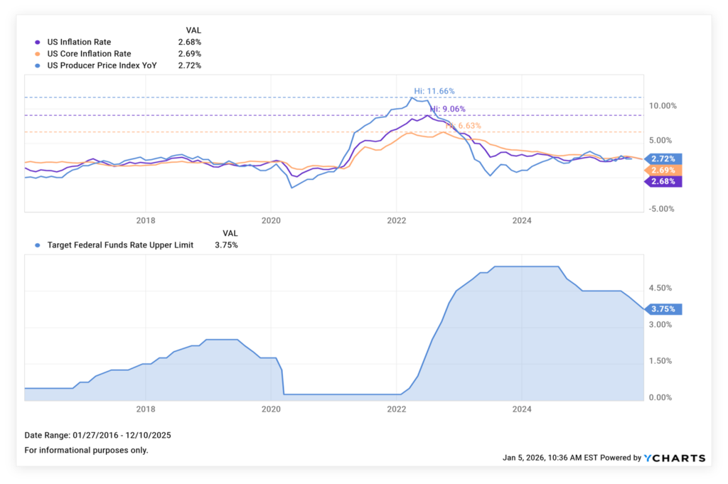Figure 8 Inflation & Interest rates: In the following charts you can see how stated inflation has declined since 2022, and how the short-term US interest rates have declined as inflation has retreated.