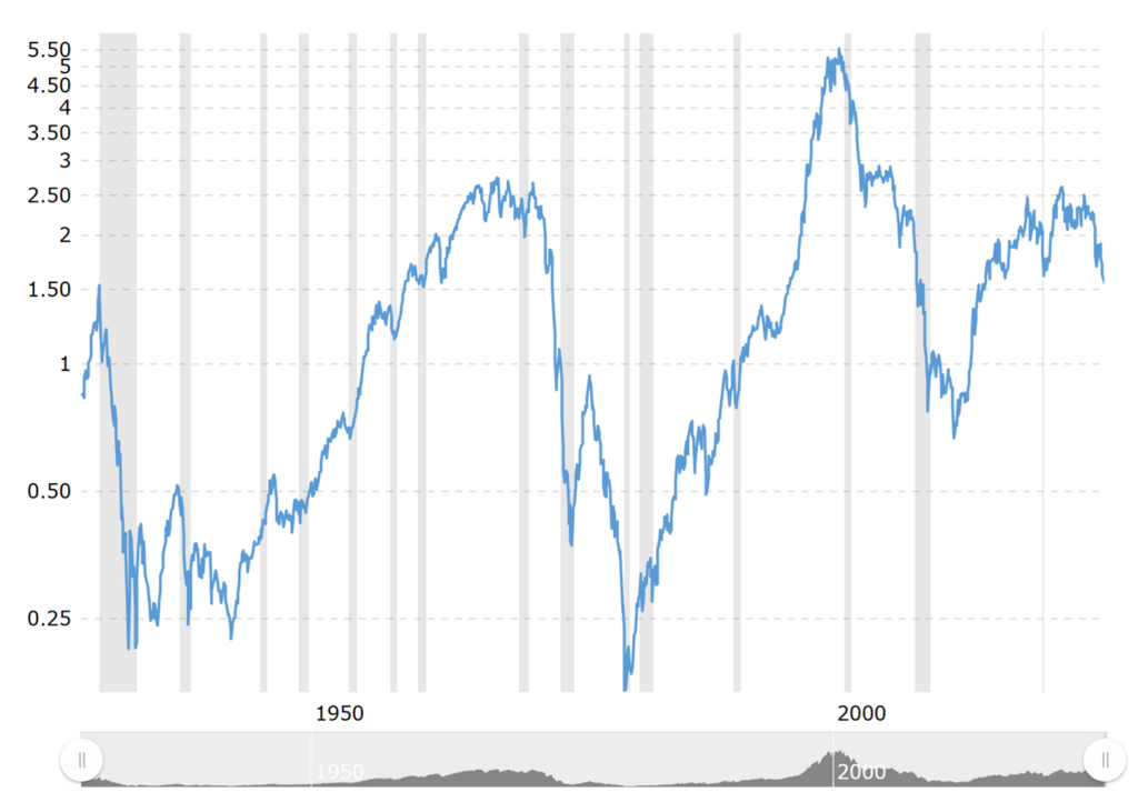 In Figure 5 Below we include a long-term picture of the S&P-to-gold ratio which tracks the amount of gold in grams it takes to buy the S&P 500. When viewed over longer periods it can give some indication of market’s view toward risk and caution.